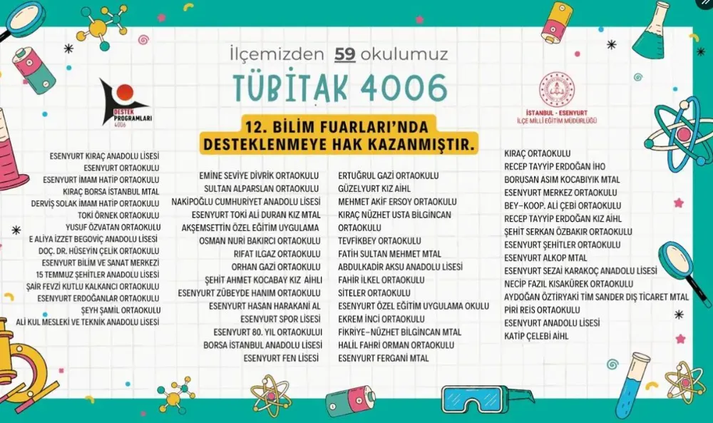Esenyurt’ta eğitim alanında gurur veren bir başarıya daha imza atıldı. İlçede TÜBİTAK 4006 Bilim Fuarları Destekleme Programı kapsamında yapılan başvurular sonuçlandı ve 59 okulun projesi destek almaya hak kazandı. Bu başarı ile Esenyurt, sadece İstanbul’da değil, Türkiye genelinde en fazla projesi desteklenen ilçe oldu.